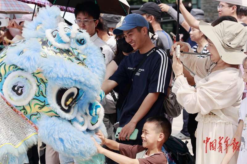 10月1日,广西南宁园博园,游客围观醒狮表演。10月1日-8日,南宁园博园举办“非遗聚园博 南宁烟花秀”国庆、中秋活动。活动以南宁烟花秀+5大非遗表演+向日葵、粉黛2大花海+萌宠互动为亮点,给市民带来丰富多彩的节日体验。中青报·中青网记者 谢洋/摄