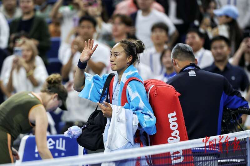 9月29日,北京国家网球中心,2025中国网球公开赛女子单打第三轮,郑钦文离场时向观众挥手致意。当日,赛会7号种子郑钦文在与捷克选手诺斯科娃的比赛中,在前两盘打成平手后,于第三盘因伤退赛,遗憾止步32强。中青报•中青网记者 曲俊燕/摄