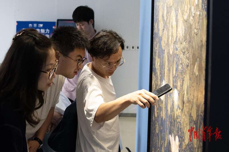 9月29日,北京水立方艺术空间,“浪潮・青年——2025全国高等美术院校青年艺术作品展”现场,参观者在仔细研究、讨论四川美术学院毕业生李颖慧的作品《鎏金纪・残荷谱》的绘画工艺。本次展览,是对高等艺术教育成果的集中展示。展览分为“潮起溯源·文脉的当代表达”“无界漩涌·多元媒介的共生激荡”“涟漪绘境·数字艺术的沉浸体验”三大板块,近千件青年艺术作品分别在鸟巢、水立方场馆展出。中青报·中青网记者 程璨/摄